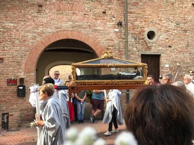 Well, she was a real person, born in 1319 there in Certaldo. I first became acquainted with her when I went into the little local church and there was a skeleton in a glass coffin. To an American, this was just incredible and quite macabre. But this is still normal in Italy and a number of churches have a local "holy" woman. On Sundays, as people come into the church, before they take their seats, most of them stop by and say a word to Giulia.